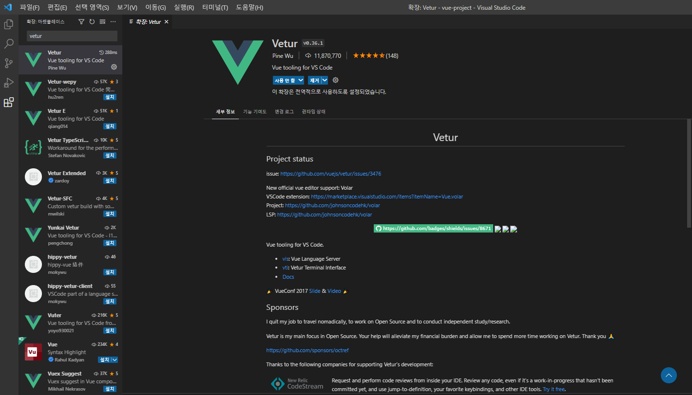 1) 우선 위에 이미지처럼 vetur를 설치 해준다.