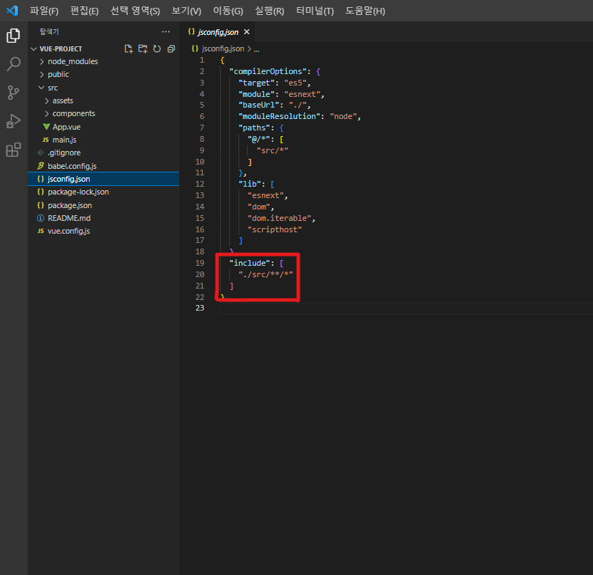 2) 그리고 아래 이미지처럼 jsconfig.json 파일을 만들어서 코드를 작성한다.