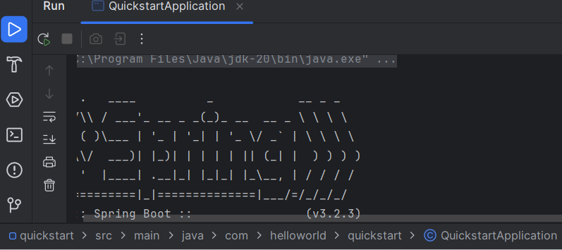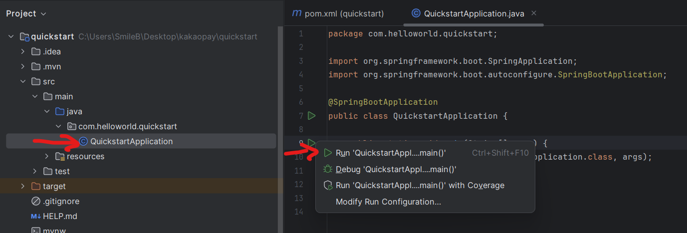프로젝트 오픈 후 main 안에 QuickstartApplication 파일을 연 다음 두번째 초록색 화살표 클릭해서 Run QuickstartApp실행