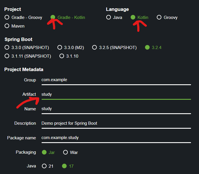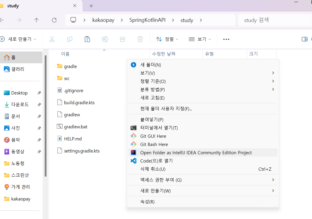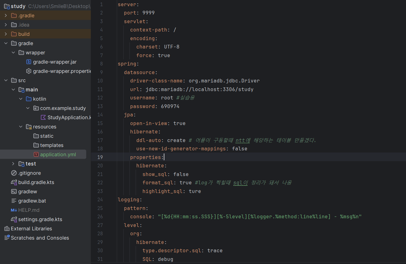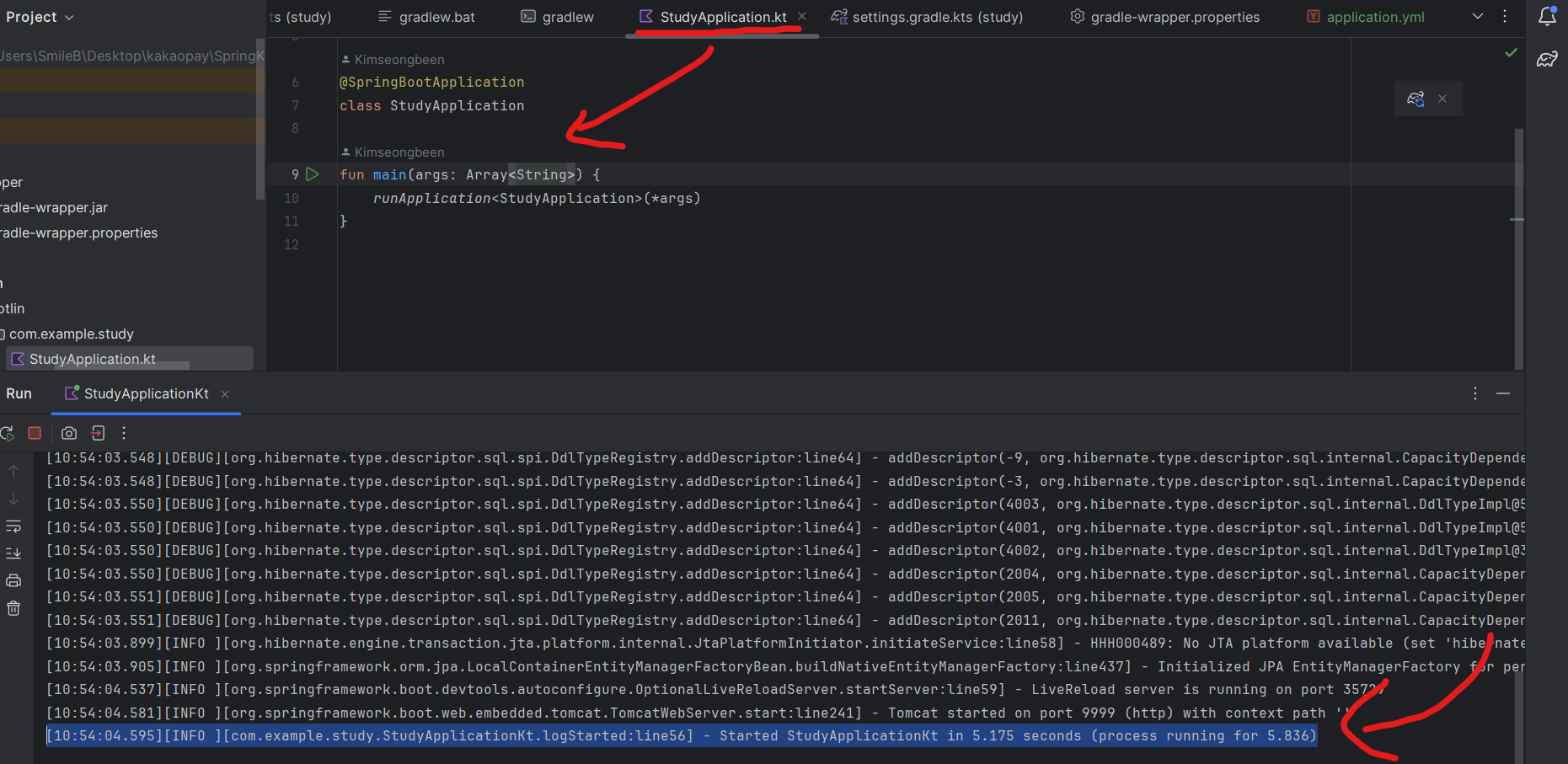 이렇게 세팅후 study applicationkt 파일 실행해보면 에러없이 동작