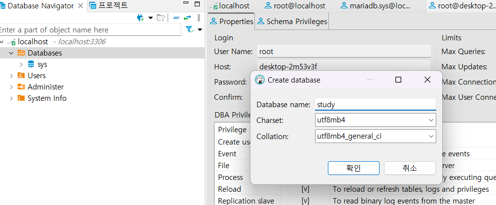 username은 그대로 했으면 root, password는 DB 만들때 작성한 비밀번호 입력.