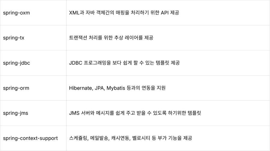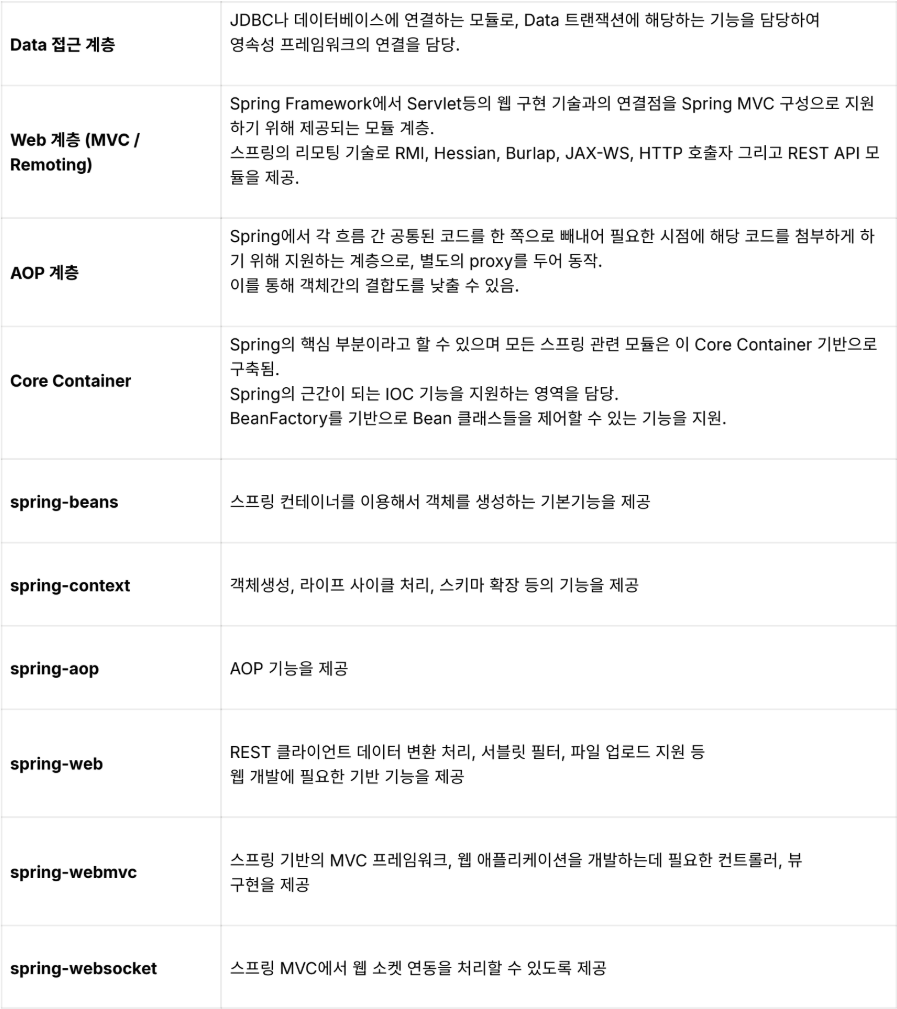 | AOP (Aspect Oriented Programming) 관점 지향 프로그래밍 | 로깅, 보안, 트랜잭션 관리 등 공통적인 관심사를 분리하여 코드 중복을 줄이고 유지보수성을 향상 시키는 기능을 지원함. |