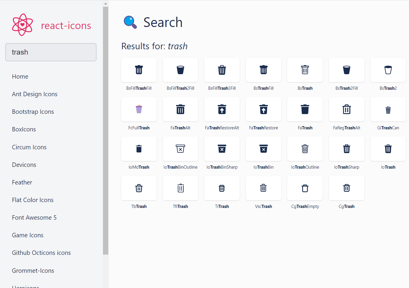 필요한 아이콘을 좌측 검색창에 검색한다. (나는 삭제 아이콘이 필요해서 trash를 검색했다)