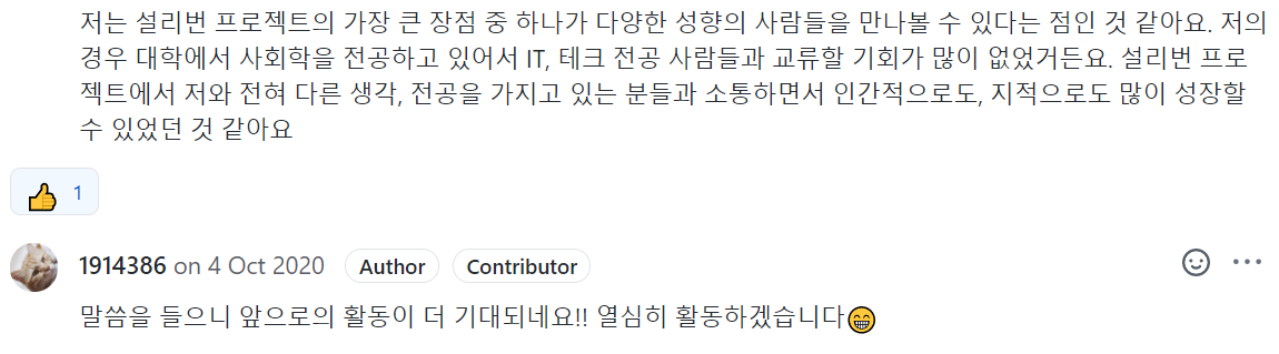 올린 다음에는 다른 사람들의 자기소개 글에 코멘트도 달아주면서, 이 사람들이랑 친해지면 좋겠다고 내심 기대했다. (하지만 11월이 지나도 코로나 때문에 만날 수가 없어..) 근데 코멘트가 많이 안 달려서 조금 아쉬웠다. 뭐 온라인이니까 어쩔 수 없지만..