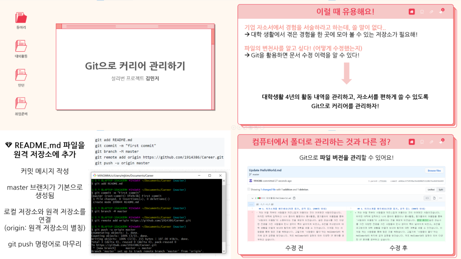 Step 0의 두 번째 미션은 낯선 지식을 교육하는 경험 해보기였다. 본격적으로 교육을 시작하기 전 맛보기로 교육을 해보는 시간을 가졌다. 개발자가 아닌 우리 주위의 사람들에게 Git과 GitHub이 유용한 분야가 있을지 고민한 끝에, GitHub 저장소로 커리어를 관리하는 교육을 기획했다. 수정 내역을 확인할 수 있는 GitHub의 장점을 활용했다.