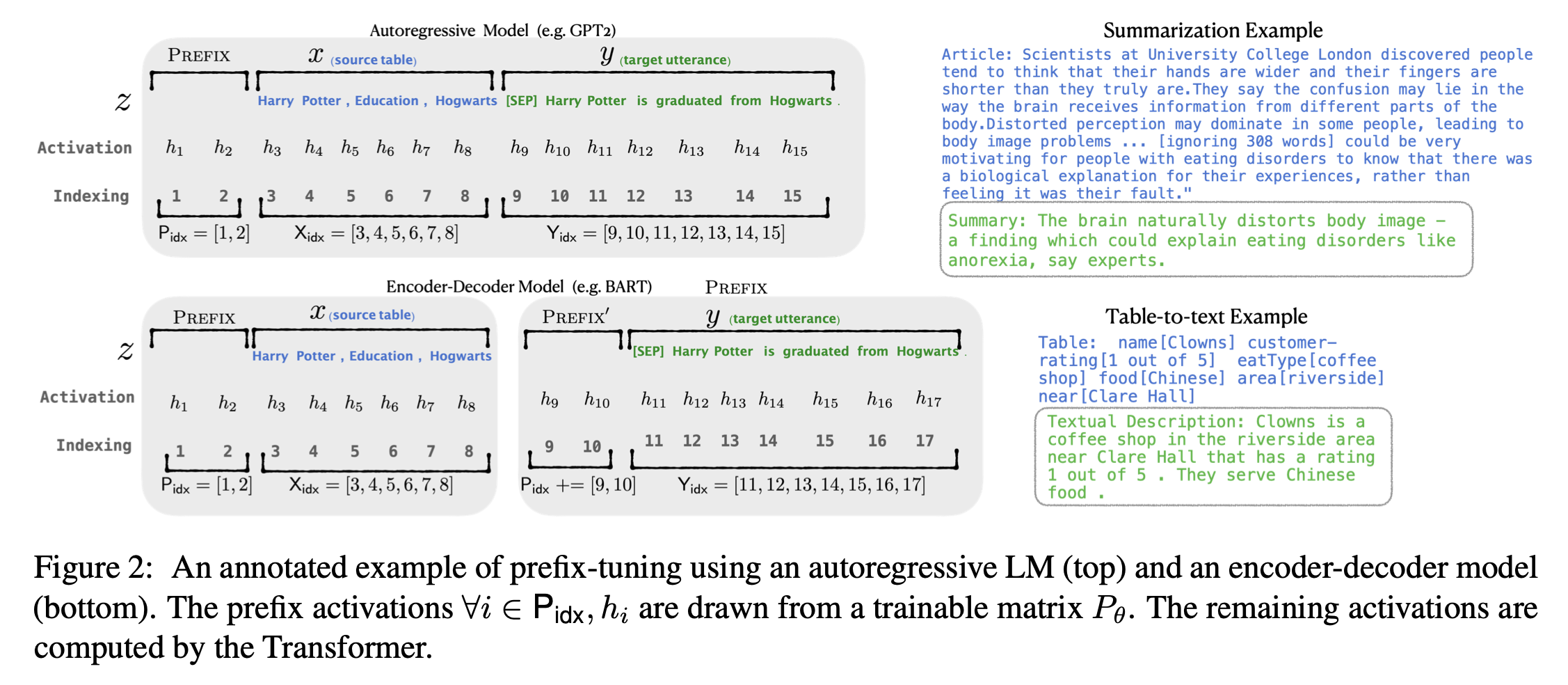Prefix-tuning은 autoregressive LM에 대해서는 를 얻기 위해 prefix를 앞에 붙이거나 를 얻기 위해 encoder와 decoder(encoder라고 쓰여있는데 오타인지 모르겠군,,,?)에 prefixes를 앞에 붙인다. Figure 2에서 볼 수 있듯이. 여기서 는 prefix indices의 sequence이고, prefix의 길이를 나타내기 위해 를 쓴다.