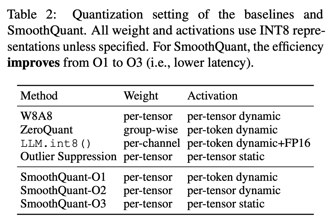 - W8A8 → Weight 8-bit, Activation 8-bit → LLM의 모든 matrix multiplication에서 weight, activation을 INT 8!