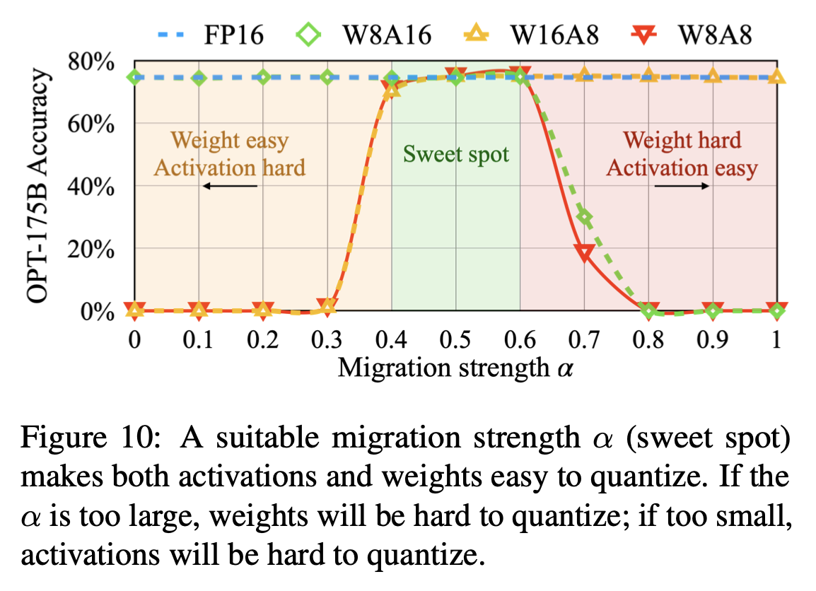 - 최종: sj=max(∣Xj∣)α/max(∣Wj∣)1−α . α를 이용해서 quantization difficulty를 얼마나 activation에서 weight로 이동시킬지 정함 ( α=0.5 가 difficulty를 activation과 Weight에 잘 나눈 well-balanced point.)