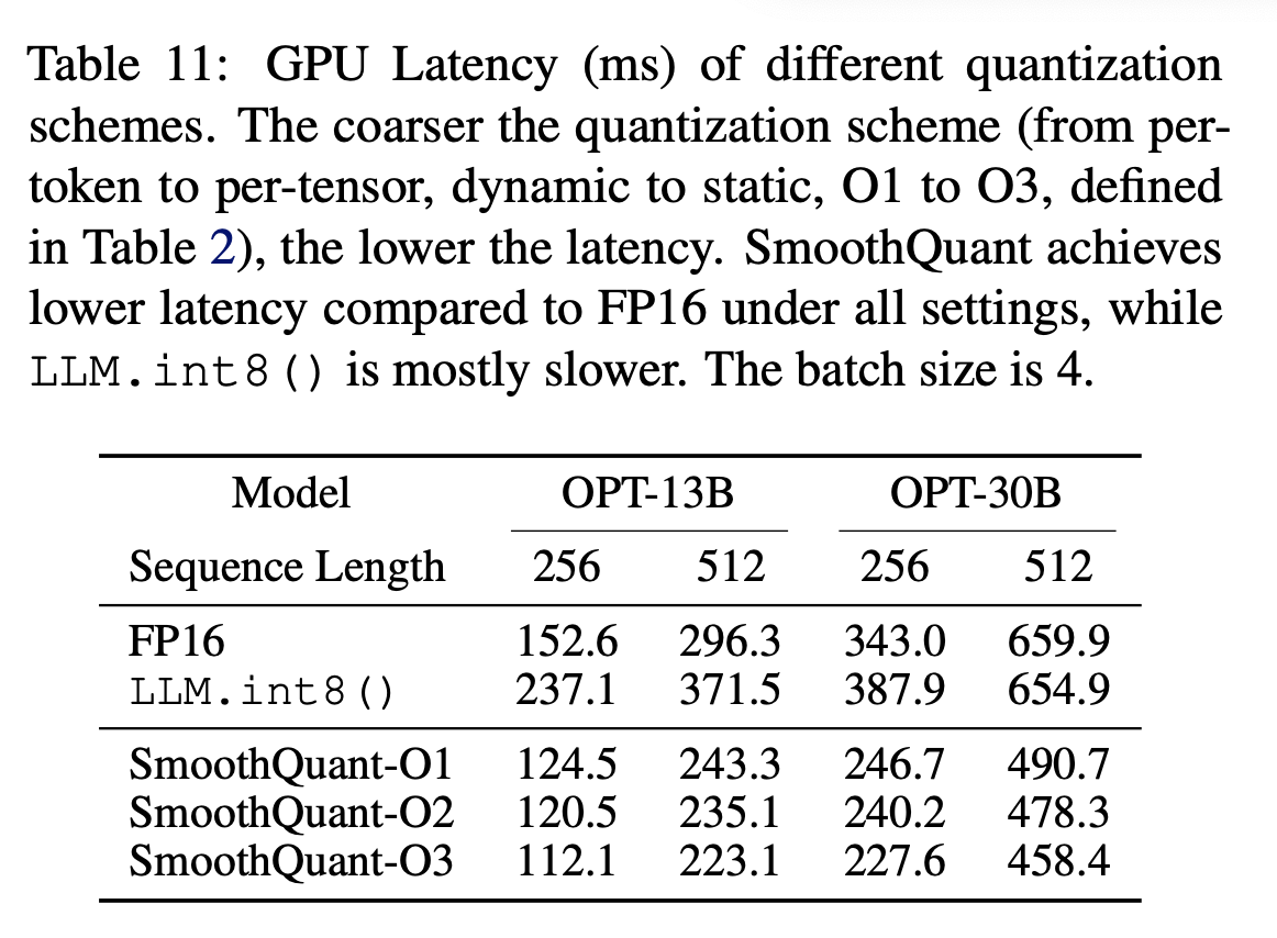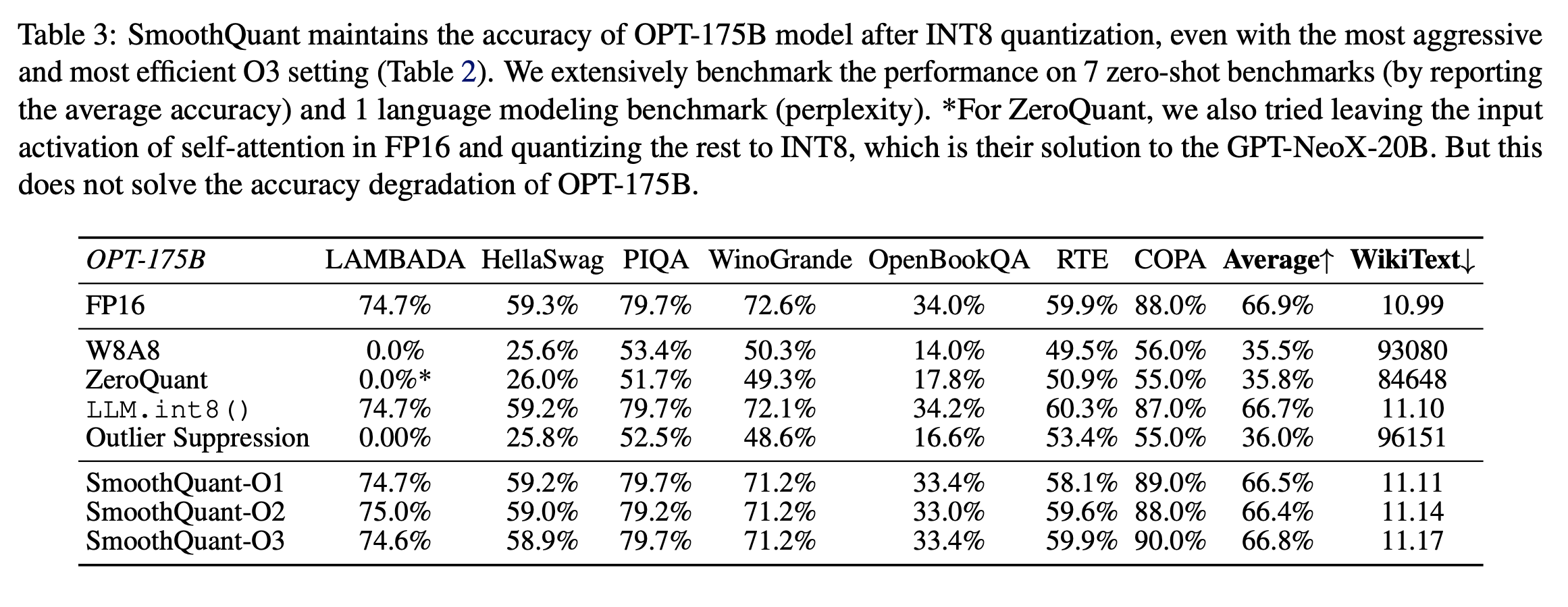 <최근 모델에 적용: SmoothQuant는 성능 손해를 최소화 하며 W8A8 quantization을 가능하게 만듦 (아래)>