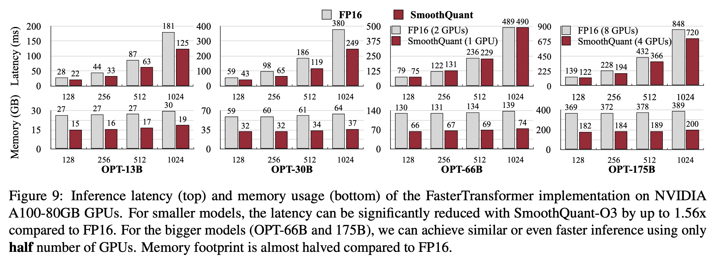 - 오른쪽을 보면, FP16과 SmoothQuant를 비교할 때 FP16에서 사용하는 gpu 수의 반만 사용하는데 latency는 비슷하거나 그 이상 → LLM serving 비용을 크게 낮출 수 있음