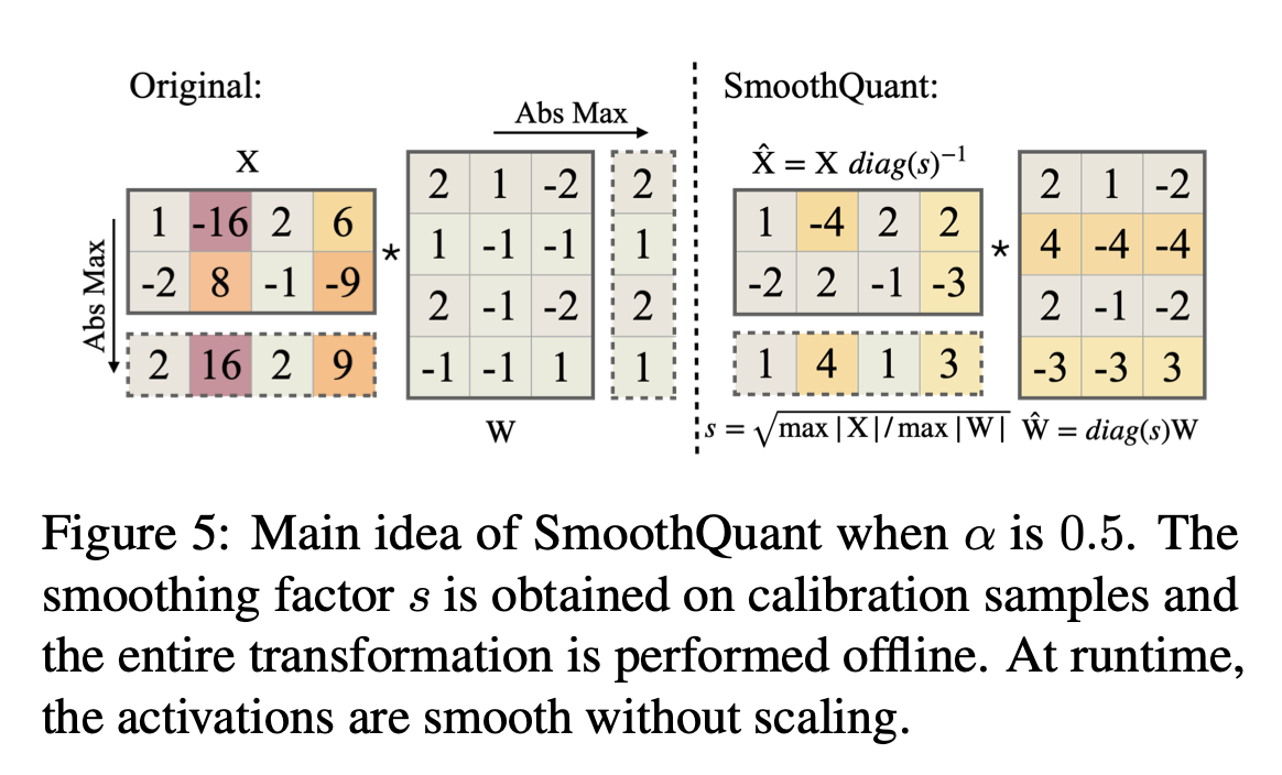 Y=(Xdiag(s)−1)⋅(diag(s)W)=((Ln−1Wn−1+bn−1)diag(s)−1)⋅(diag(s)W) 이렇게 볼 수 있으니까 scaling factor 계산을 runtime 전에 미리 해놓으면(offline), runtime동안 scaling factor로 인한 overhead는 발생하지 않는다.