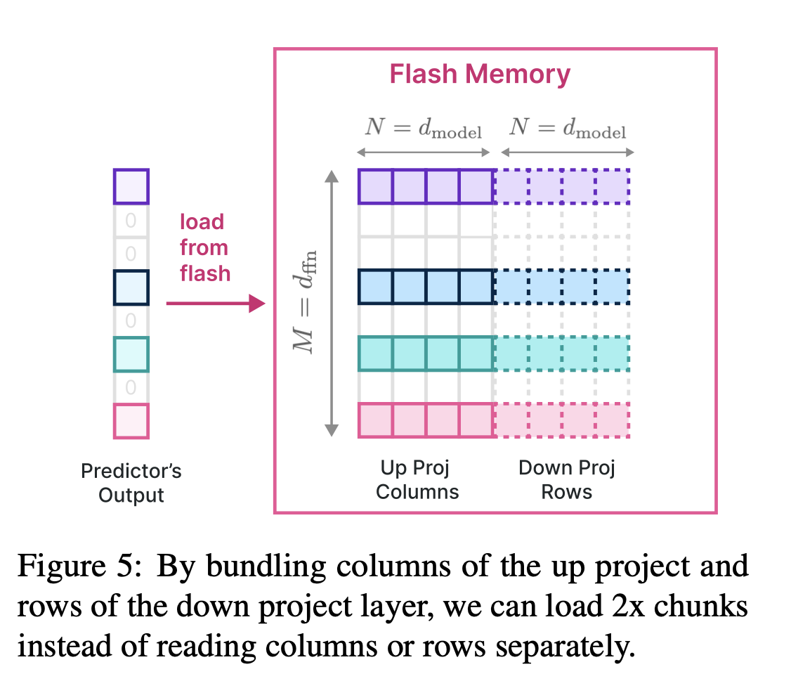 따라서 해당 column과 row를 함께 flash memory에 저장함으로써 데이터를 더 큰 청크로 통합하여 읽을 수 있다. Predictor를 통해 활성화 될 intermediate neuron을 파악한 후, 해당하는 Up proj column & Down proj row를 통합한 bundle Load