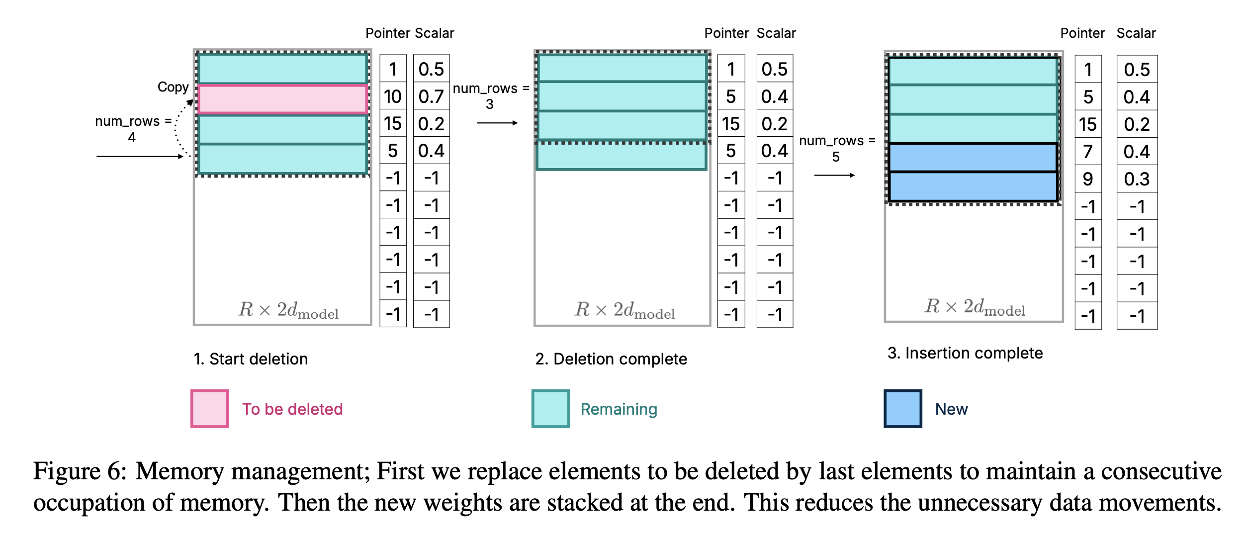 → 불필요해진 것을 없애주고, 아직 사용 중인 것들을 불필요해진 것의 자리에 넣어주며 위로 정렬을 한다. 그리고 아직 사용중인 것들은 별도로 삭제해주지 않으며 삭제 overhead를 줄여주며, num_rows를 활용하여 사용되는 row들을 말해준다. 의 neuron이 삭제될 때, 만큼의 memory rewrite 가 필요.