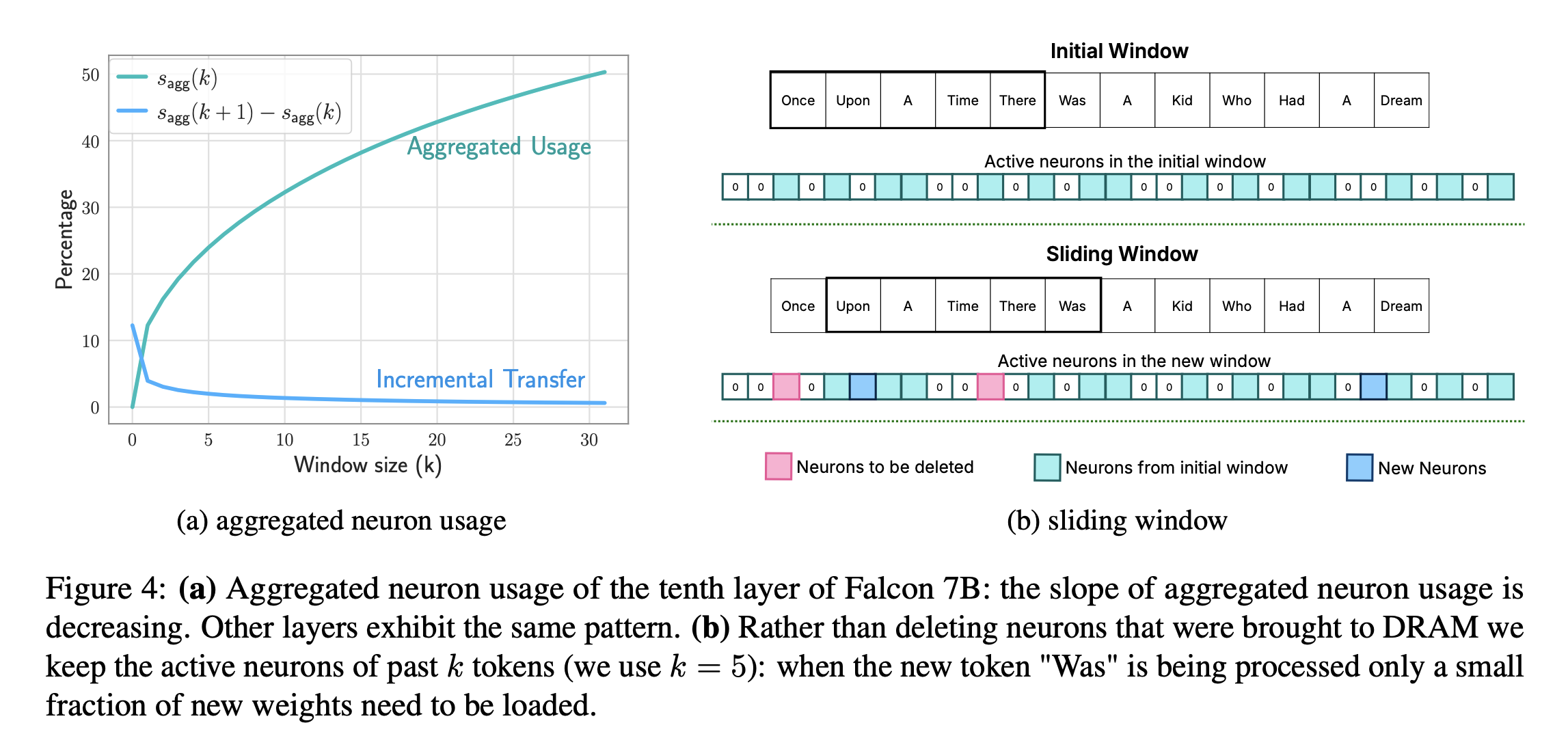 (a) : window k 증가 → active neuron(aggregated usage)의 비율이 늘어남 & 다음 토큰이 올 때 update 되는(load & unload) 뉴런의 비율이 줄어듦
