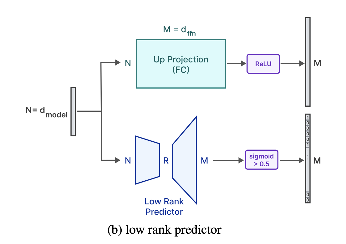 전체 up-projection matrix를 불러오지 않게 하기 위해 Low-rank predictor를 사용해 ReLU에 의해 0이 되는 요소들을 식별(”Deja vu: Contextual sparsity for efficient LLMs at inference time” 논문 따름)