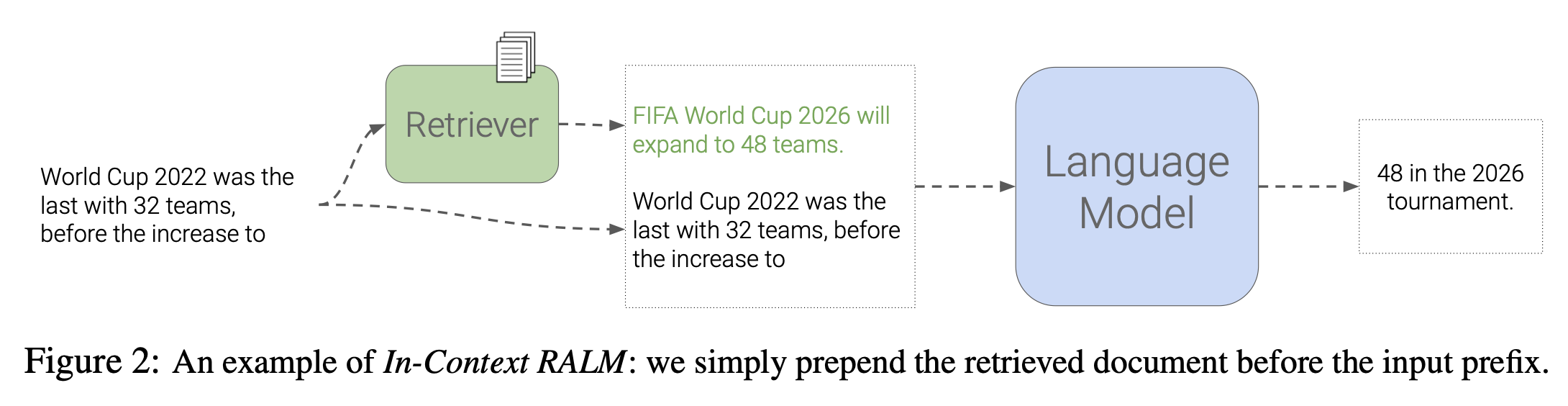 - In-context RALM: LM architecture를 변화시키지 않고, grounding documents를 입력 앞에 추가 (추가 LM 학습 없이)