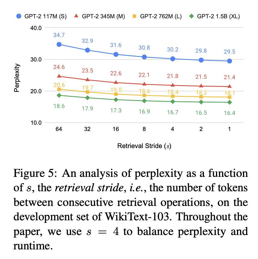 - retrieval stride s가 작을수록 더 우수한 성능 → 그러나 시간은 더 오래걸림