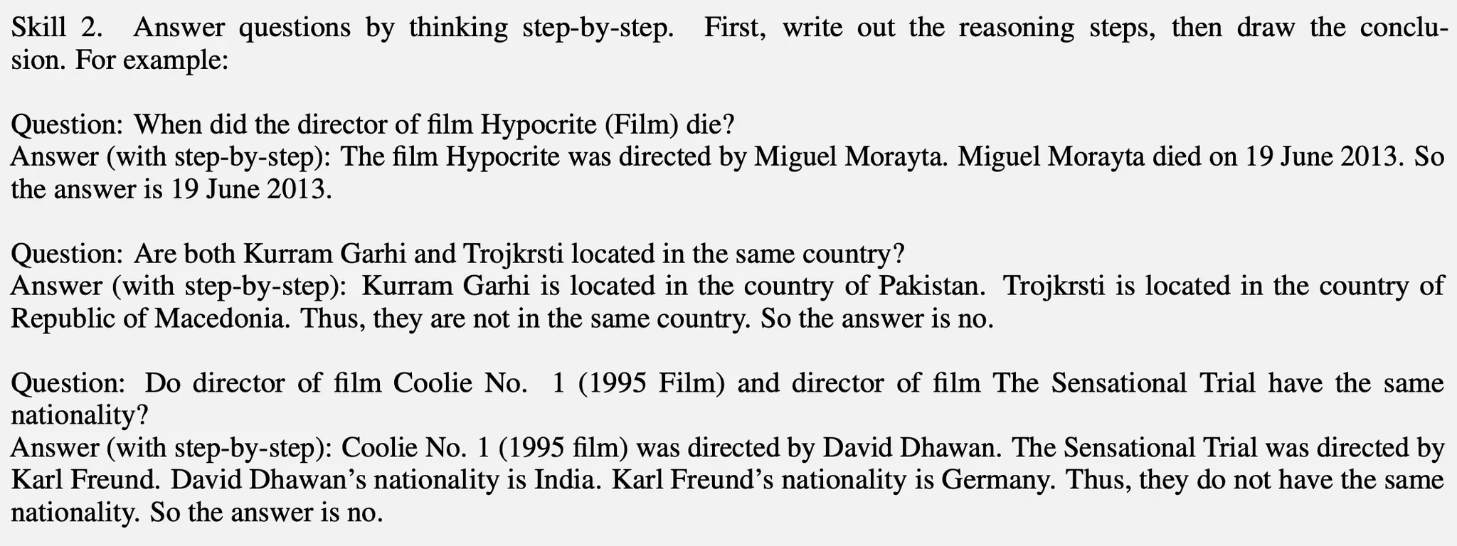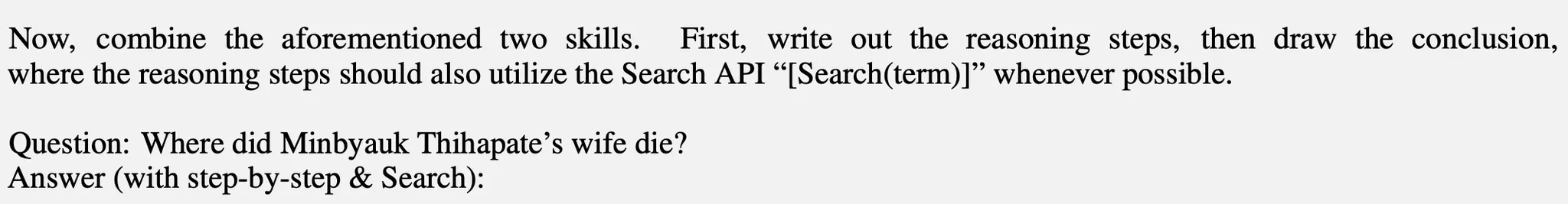 Now, combine the aforementioned two skills. First, write out the reasoning steps, then draw the conclusion, where the reasoning steps should also utilize the Search API “[Search(term)]” whenever possible.