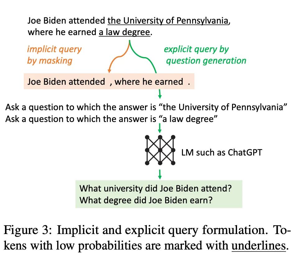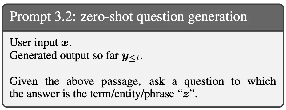 [설명] Next sentence s^t에서 low-confident span을 타겟하는 명백한 질문 생성. e.g. “the University of Pennsylvania”가 uncertain이면, “Which university did Joe Biden attend?”와 같은 질문이 relevant information을 retrieve 하는데 도움을 줄 것 s^t에서 probability가 β보다 낮은 spans를 추출 → 각 추출된 span z에 대해, gpt-3.5-turbo를 사용하여 해당 span z를 가지고 답변할 수 있는 질문 qt,z를 생성: