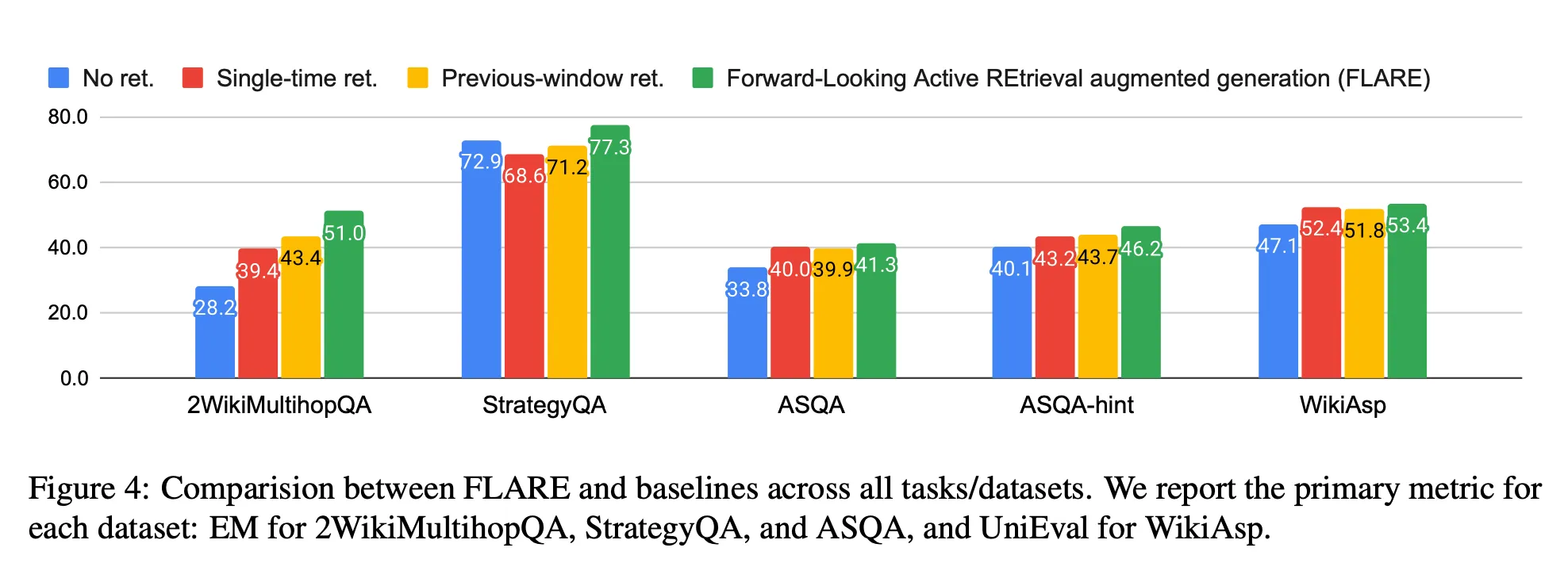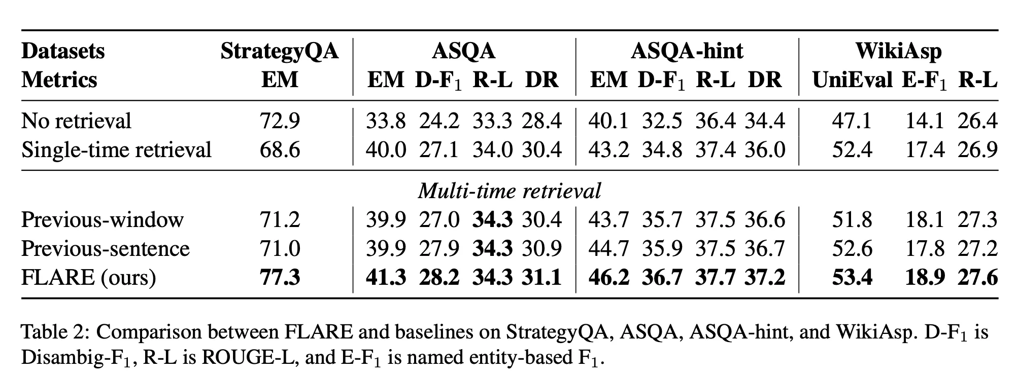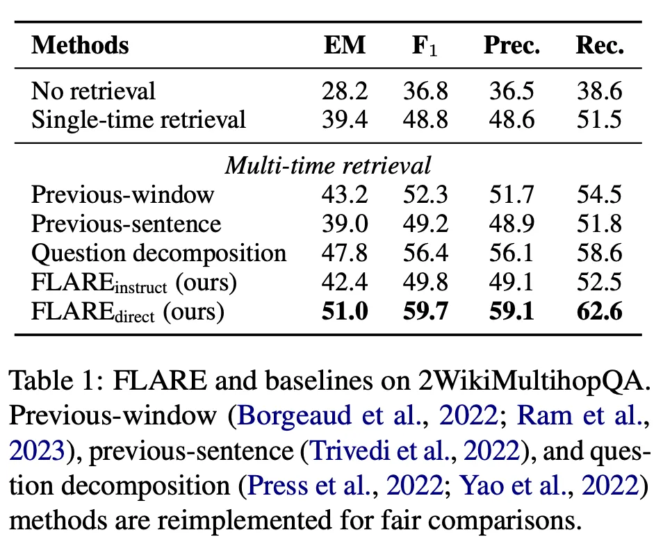 FLARE가 모든 baseline보다 성적이 좋았으며, 대부분의 multi-time retrieval augmented approaches가 single-time retrieval보다 좋은 성능을 보였다.