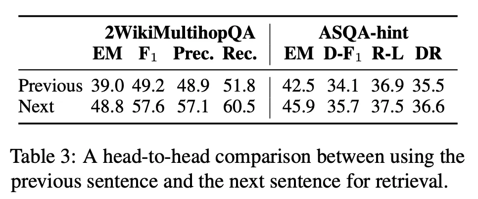 이전 context 사용해서 retrieving 하는 것보다 next sentence를 가지고 retrieving 하는 것이 더 낫다는 결과가 있다 (Table 3)