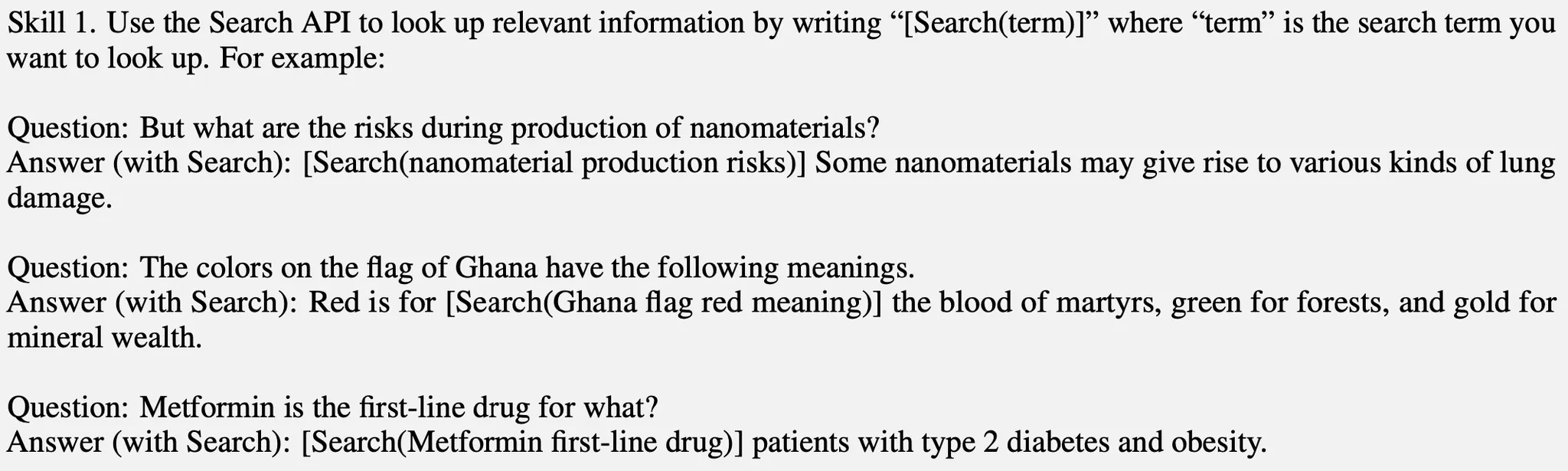 e.g. “The colors on the flag of Ghana have the following meanings. Red is for [Search(Ghana flag red meaning)] the blood of martyrs, ...”