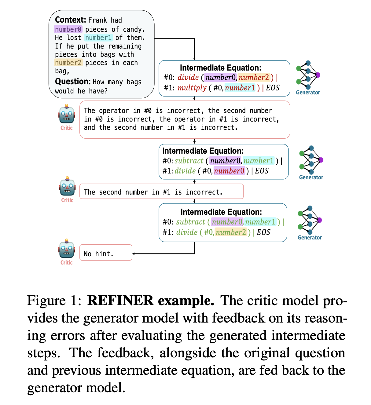 Generator에 의해 가 생성되거나 critic에 의해 "No hint"가 생성되면 생성을 멈춘다.