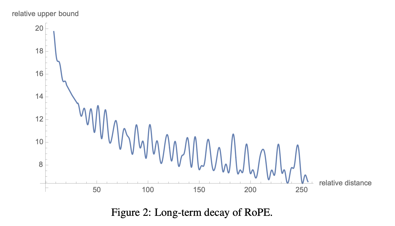 Long-term decay : Vaswani et al. [2017]에 따라 우리도 θi=10000−2i/d로 설정했다. 이러한 세팅이 long-term decay property를 제공하는 것을 설명할 수 있다(section (3.4.3)에 언급됨). 이는 inner product가 상대적 위치가 증가하면 약해진다는 뜻이다. 이러한 특성은 긴 상대적 거리를 가진 한 쌍의 토큰들이 적은 커넥션을 가져야 한다는 직관과 일치한다.