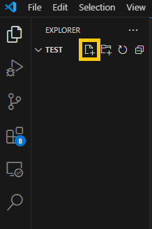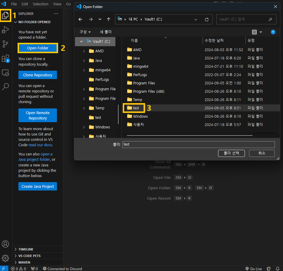 좌측 바에서 EXPLORER를 선택하고 Open folder를 선택한 뒤, 이전에 만든 테스트 폴더를 선택한다.