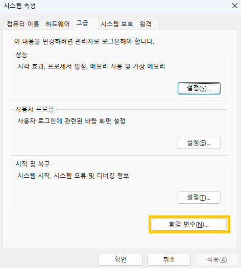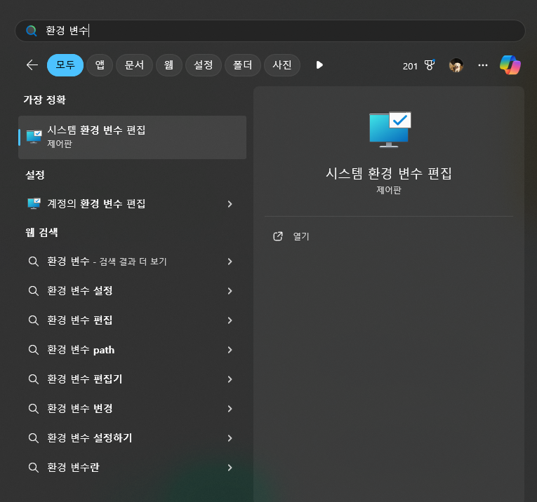 시작 메뉴에서 '환경 변수'를 검색하여 '시스템 환경 변수 편집'을 선택한다.