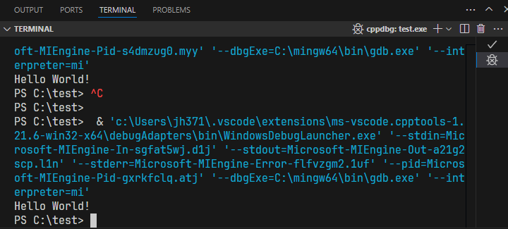 다시 파일로 돌아오면 C++코드도 정상적으로 실행되는 것을 볼 수 있다.