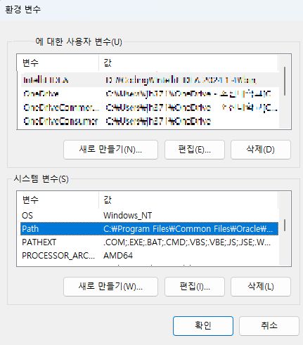 시스템 변수에서 'Path'항목을 찾고 더블 클릭 또는 '편집'을 눌러 들어간다.