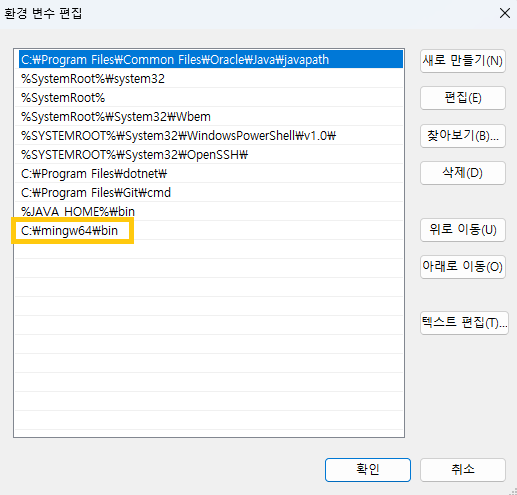 환경 변수는 반드시 컴파일러를 설치한 폴더에 \bin를 추가한 상태이어야 한다. 만약 다른 폴더에 컴파일러를 설치했다면 해당 폴더의 경로에 \bin을 추가해서 작성하여야 한다.