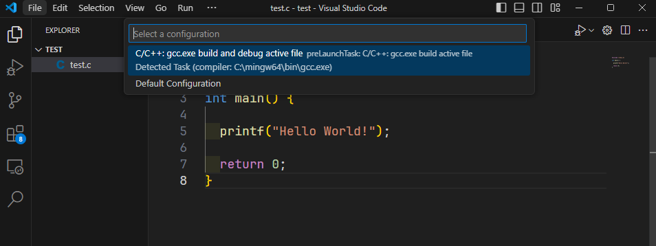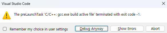 다시 기본으로 선택되어있는 C/C++:gcc.exe build and debug active file을 선택하여 실행시킨다.