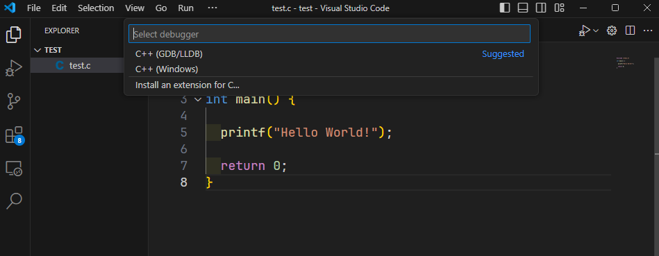 Vs Code에서 실행 단축키는 f5이다. f5를 눌러 실행시키고 Suggested태그가 붙은 C++(GDB/LLDB)를 선택한다.