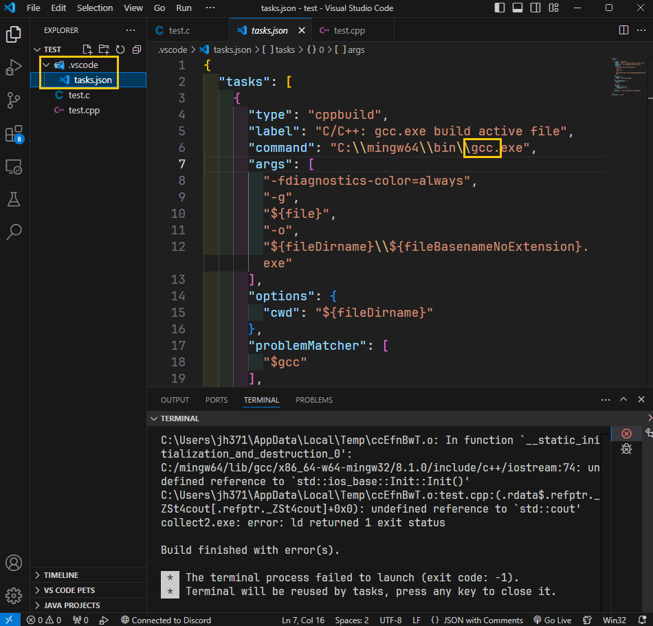 .vscode에 들어가 tasks.json파일을 열고 command항목의 gcc를 g++로 수정해준다.