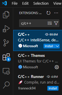 좌측 바에서 EXTENSIONS탭을 선택하고 C/C++를 검색한 뒤 마이크로소프트의 뱃지가 붙어있는 C/C++를 설치한다.
