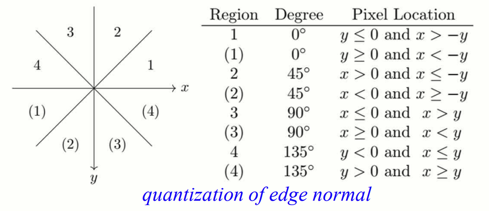 검출된 edge 의 폭을 얇게(thinning) 만들어 edge 의 정확도를 높입니다. 같은 방향으로 뻗은 edge 들 중 단 한 개의 edge 만 남기고 나머지는 제거하는 방식입니다. 이것을 구현하기 위해 미분 결과의 최고값만을 남기고 어중간한 값들은 배제합니다. 이 과정은 thresholding 만으로는 정교하게 수행될 수 없기에 다음과 같은 과정을 거칩니다.