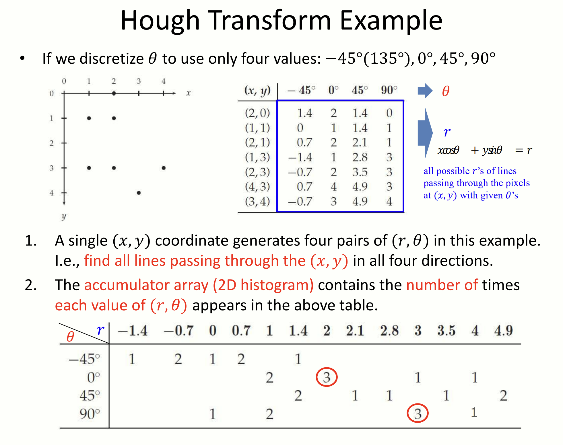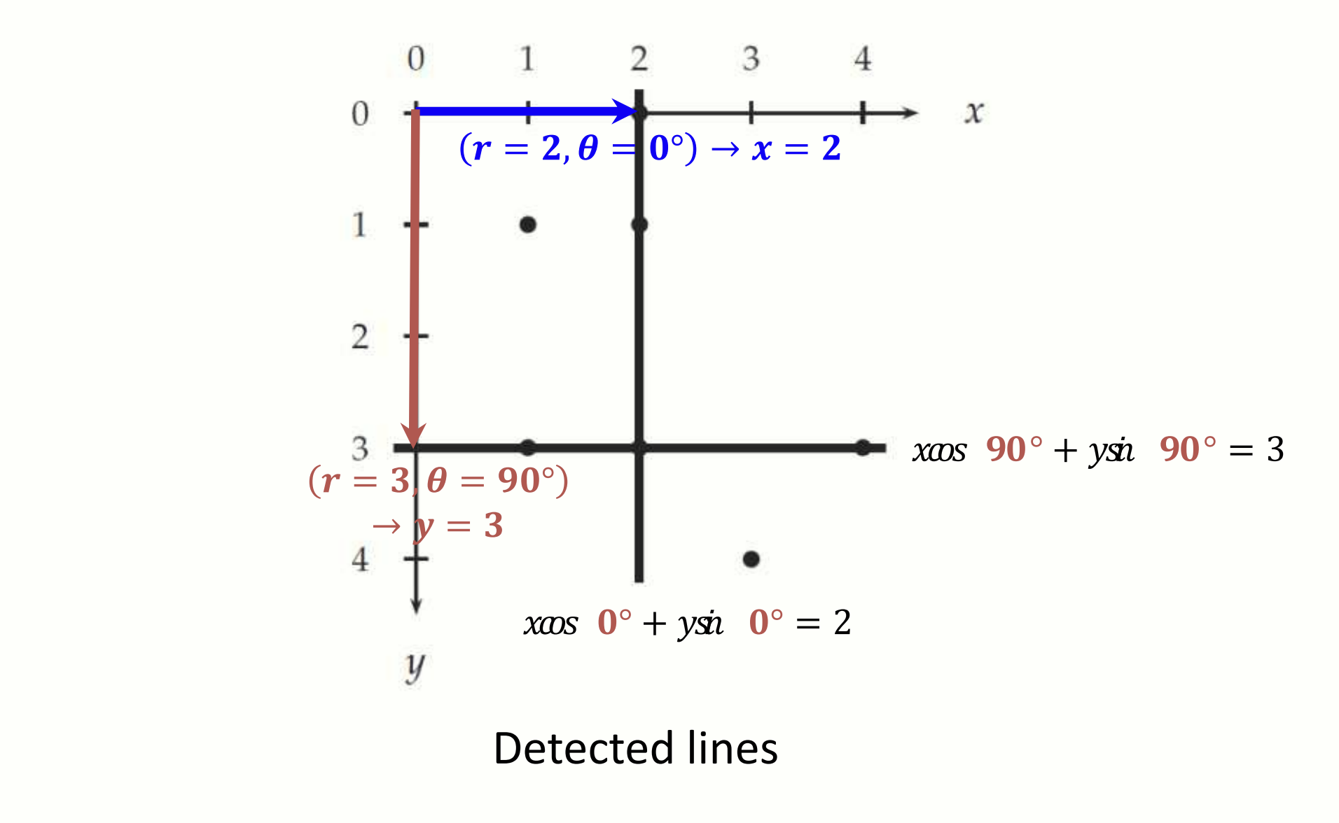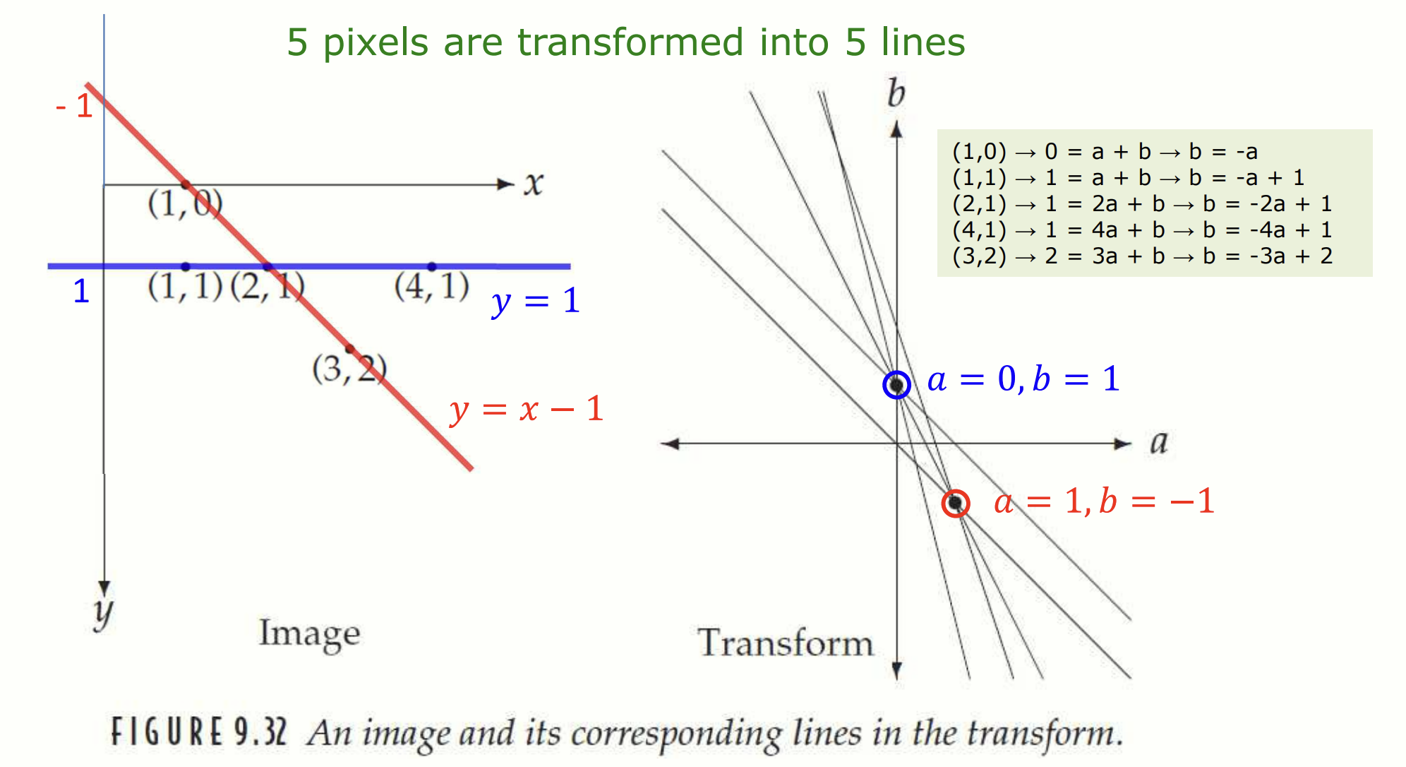 위의 figure 를 해석해봅시다. 우리는 이미지의 다섯 개의 좌표를 알고 있습니다. 이 좌표들을 좌표평면으로 옮겨서 다섯 개의 직선을 그렸습니다. 가장 많은 직선이 지나가는 교점은 (), () 입니다. 이 점을 다시 좌표평면으로 옮기면 , 직선을 얻을 수 있습니다. 과연 이 직선들은 세 점이 지나가는, 즉 가장 많은 점이 지나가는 직선이군요! 이로서 우리는 이미지에서 가장 지배적인(dominant) 두 가지 직선을 알아냈습니다.