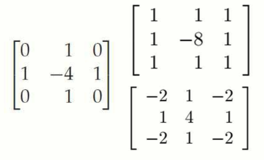 Laplacian filter 는 이미지에 2차 미분을 계산하여 edge 를 검출하는 방법입니다. 필터의 수식은 아래와 같습니다: