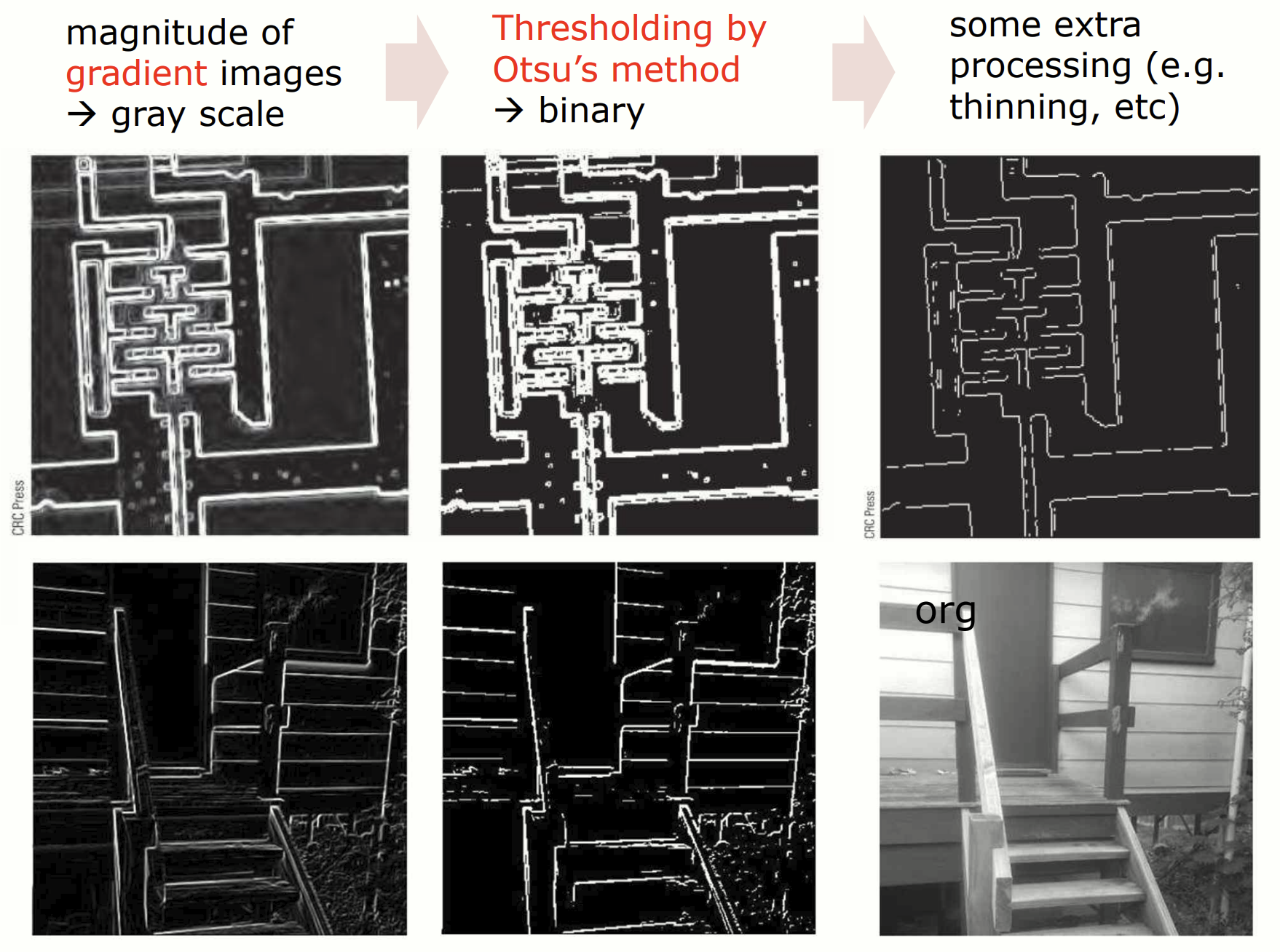 Prewitt filter 를 통해 계산된 Gradient 이미지 생성 -> Otsu's method 로 edge 를 흑백으로 분리 -> 검출된 edge 를 얇게 하거나 불필요한 noise 제거