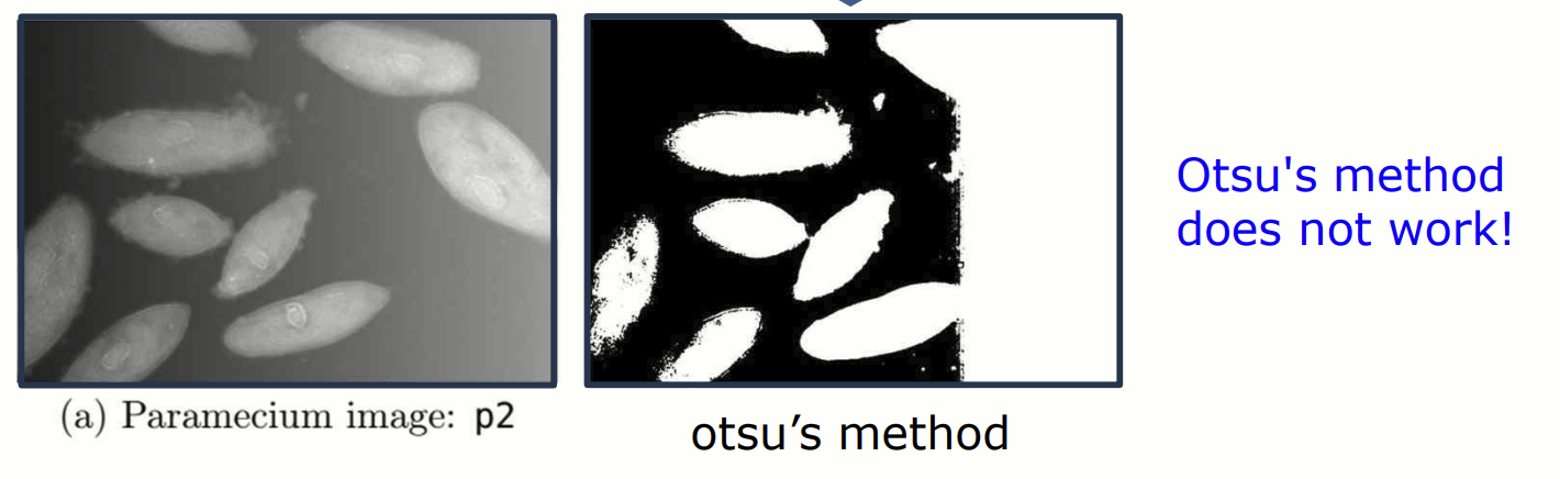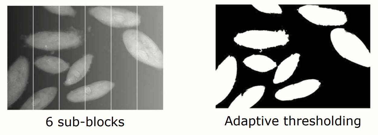 Otsu's method 와 가은 전역(global) 임계값은 이미지 전체에 하나의 임계값을 적용합니다. 하지만 배경과 객체의 밝기가 고르지 않은(non-uniform illumination) 경우, 임계값은 효과적으로 작동하지 않을 수 있습니다. 위 figure 에서 Otsu's method 로 임계값 를 적용했지만, 배경 일부가 객체와 섞이는 문제가 발생했습니다. 이러한 문제를 해결하기 위해 adaptive thresholding 이 사용됩니다.