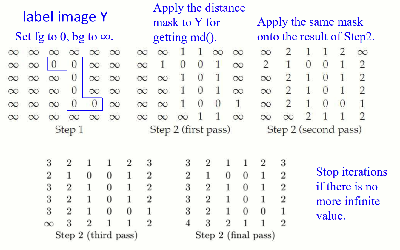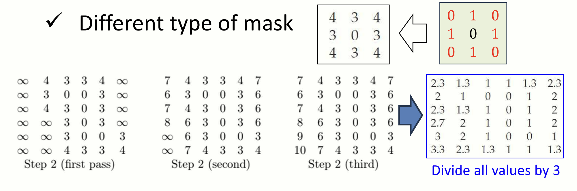 Step 2) 갱신: 주변 이웃 픽셀과의 최소 거리 값을 반복적으로 계산합니다. 이 때 distance mask을 씌워 이웃값들을 구합니다: