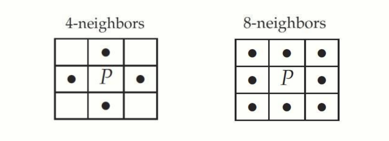 어떤 조건에서 픽셀이 다른 픽셀과 인접하다고 할 수 있을까요? 이번 장에서는 binary image 를 기준으로, 픽셀의 위치 만 고려합니다.
