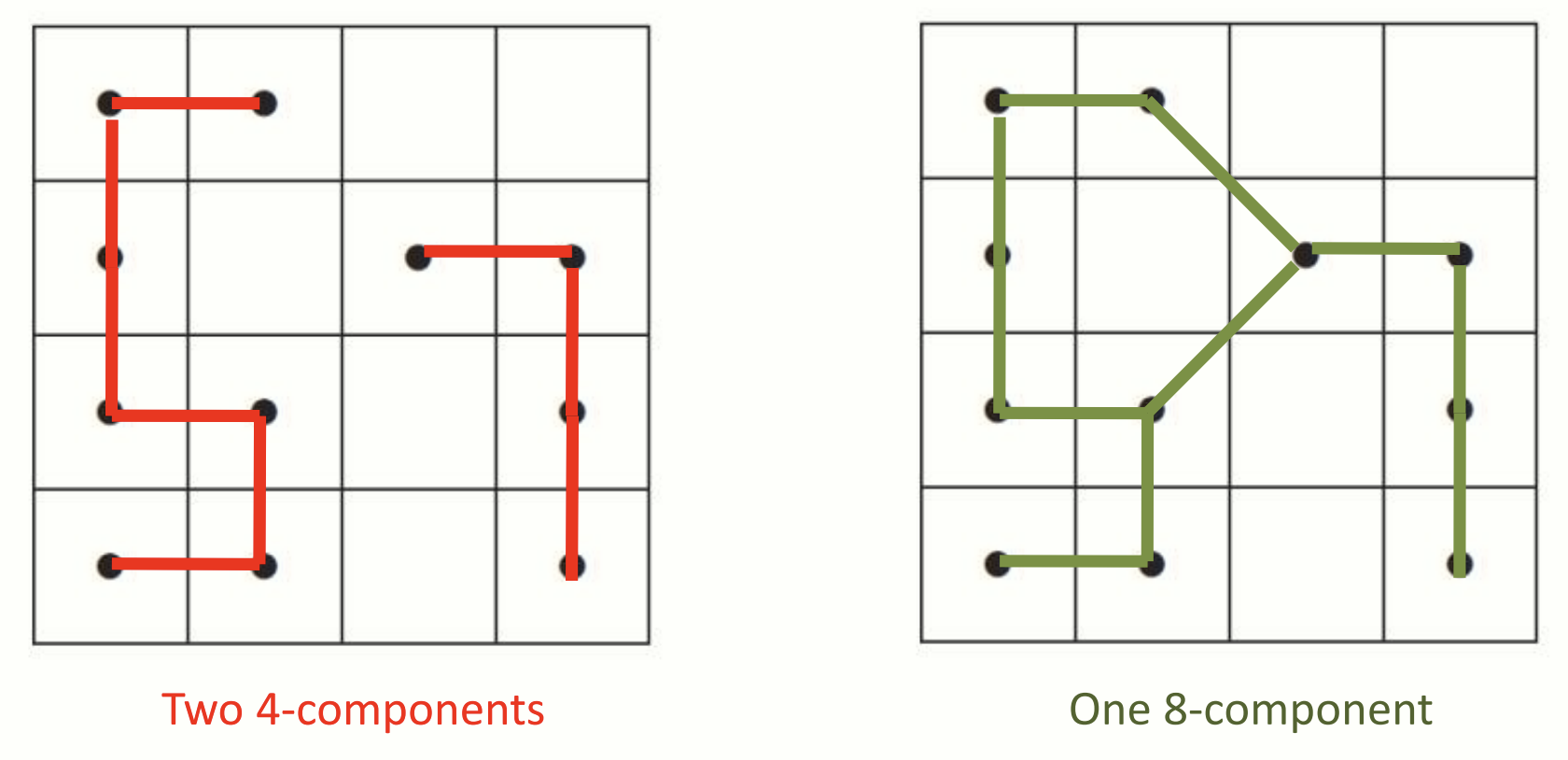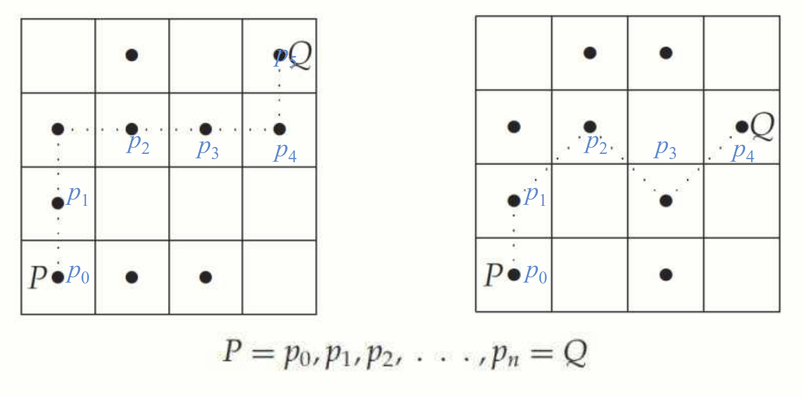 왼쪽의 P 와 Q 는 4-connected, 오른쪽의 P 와 Q 는 8-connected