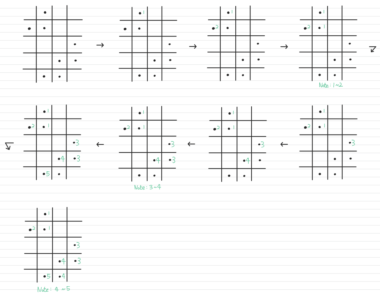 두번째 스캔에서는 우측 하단(bottom-right)에서 좌측 상단(top-left)으로 역방향으로 진행하며 값을 수정합니다.