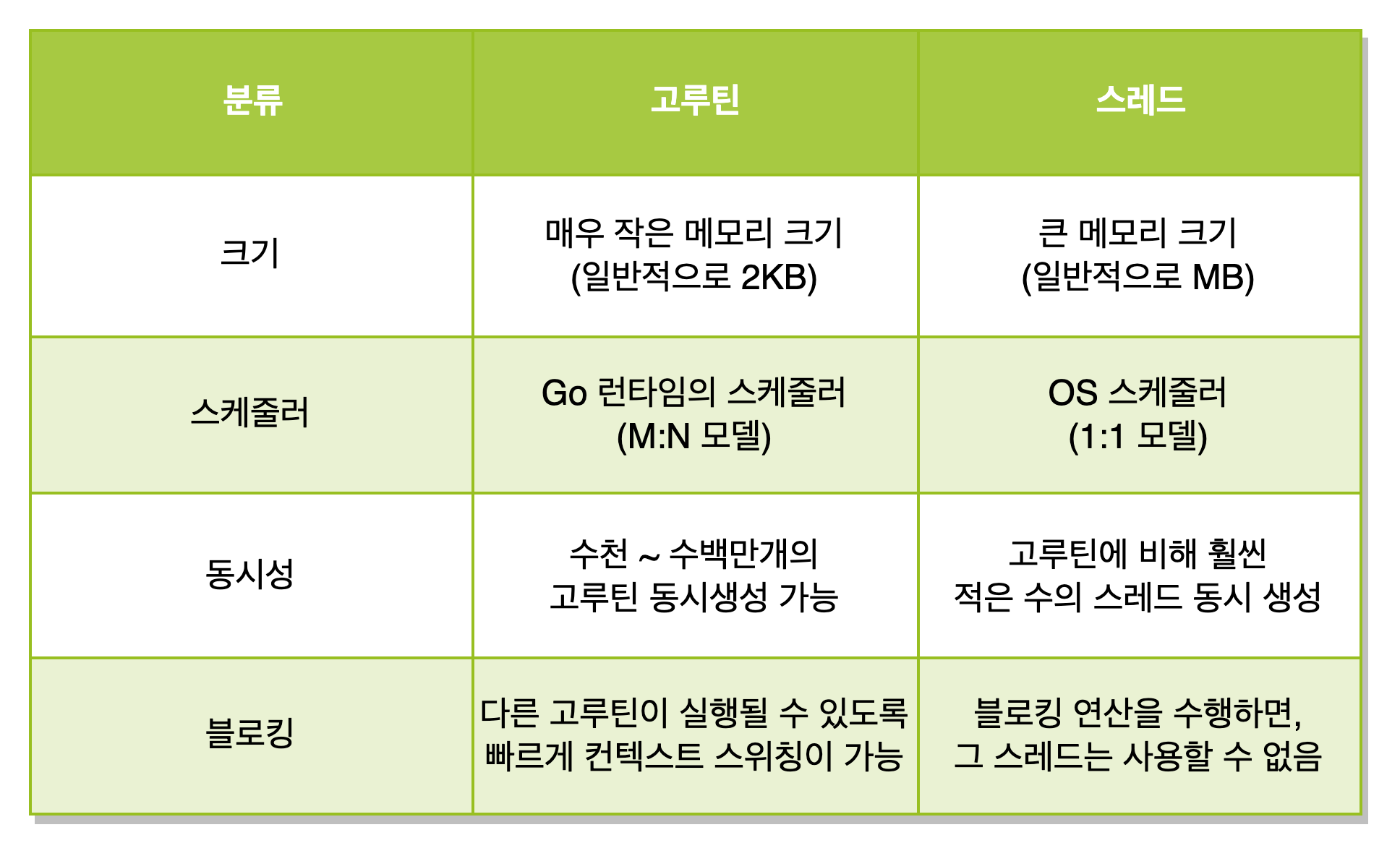 - 고루틴은 Go에서 경량 스레드와 같은 역할을 하는 실행 단위이다.