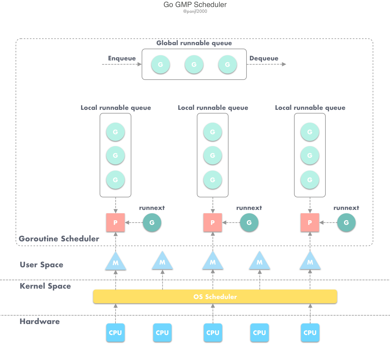 - 이를 위해 M:N 스케줄링 모델을 사용하며, M은 고루틴의 수, N은 OS 스레드 수를 의미한다.