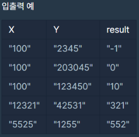 주어진 두 문자열 X, Y는 정수로 이루어진 문자열이다. 둘을 비교하여 서로 짝을 이루는 숫자들을 모은다. 모은 숫자들로 가장 큰 수를 만들어 return한다. 짝을 이루는 숫자가 없다면 "-1"을 return한다. 0은 두개 이상 짝을 이뤄도 "0"을 return한다.