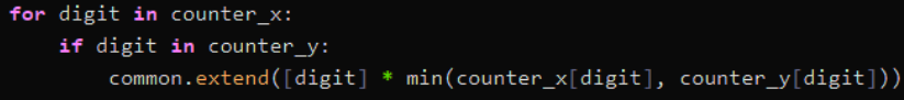 👉 : 두 문자열에서 공통으로 등장하는 숫자와 그 빈도수를 비교하여, 최소 빈도수만큼 common 리스트에 추가하는 코드